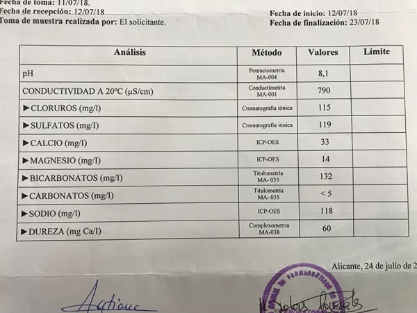 Recientemente realizamos en la empresa una analítica para ver las sales en el agua, he de decir que no soy químico con lo cual el resultado no se si es el correcto o no, el agua la almacenamos en un pozo a la salida del descalcificador y en este la mezclamos con agua de la calle para bajarle la acidez hasta los 8-12º F, nuestra empresa es un gimnasio y la analítica del agua esta realizada almacenada en dicho pozo.
