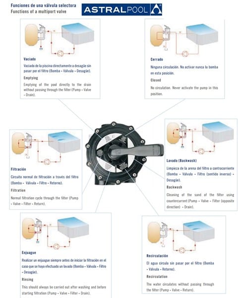 Posición de Circulación/Recirculación, como su nombre indica, lo que permite es que el agua circule sin pasar por el filtro de arena. Puede parecer absurdo, pero es la opción indicada cuando tenemos cascadas, fuentes y otros accesorios de hidroterapia como complemento a nuestra piscina. También se suele usar esta posición cuando se añaden los productos químicos a la piscina.