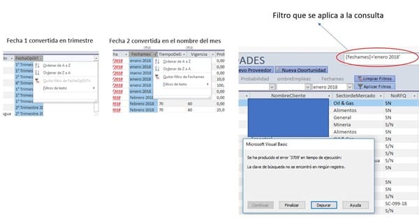 Te adjunto estas dos imagenes, como puedes ver al tratar de dar filtro manual a la consulta estas no me muestran la opcioon para seleccionar, otro lado cuando trato de aplicar el filtro por vba y el combobox de las fechas, este me da este error, te agrego el codifo que estoy usando para filtrar, que con todos los campos anteriores me funciona perfectamente, excepto con estas fechas calculadas,
