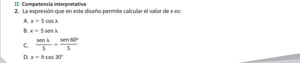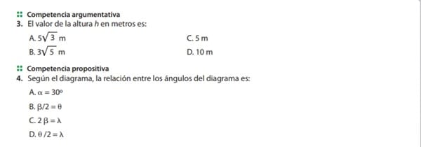 $$\begin{align}&2.\\&sen(30°) = \frac{5}{x}\\&x = \frac{5}{sen(30°)} \\&\text{Sabemos que sen(30°) = \cos(60°), así que también podemos escribir}\\&x = \frac{5}{sen(30°)} =\frac{5}{\cos(60°)}\\&\text{No se parece a ninguna de las opciones, así que vamos a explorar la opcion del coseno}\\&\cos(30°)=\frac{x}{h} \to x = hcos(30°) \text{ (Opción D)}\\&\\&3.\\&sen \alpha = \frac{h}{10} \to h = sen(60°) \cdot 10 = 5 \sqrt{3} \text{ (Opción A)}\\&\\&4.\text{Sabemos que }\alpha = \theta = \lambda = 60°\\&\text{El que no queda claro es el valor de } \beta \text{, pero para que tenga sentido alguna de las opciones}\\&\text{la única posibilidad es que } \beta \text{sea solo la mitad del ángulo superior, por lo que } 2 \beta = \lambda\end{align}$$