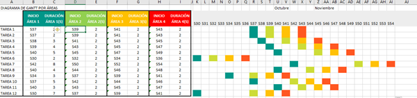 Estoy haciendo un gantt en excel, pero con diferentes áreas, ya que para una sola tarea están involucrados hasta 4 áreas, y cada una de ellas se toma un número de semanas.