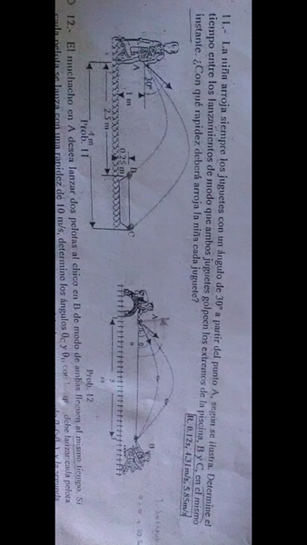 Si despejas el tiempo (t) de cada una de las ecuaciones lo eliminarías y te queda: y= f(x) ... que es la trayectoria. Tendrás una parábola distinta para cada juguete... y(x) = 0.75 + x tg 30° - 9.80 x^2 / 2 Vo^2 cos^2( 30)°...