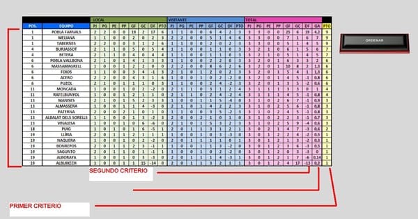En la columna PUES. Mediante la función JERARQUÍA he logrado ordenarlos mediante una macro por la columnas PTO, DF y GA (por ese orden).