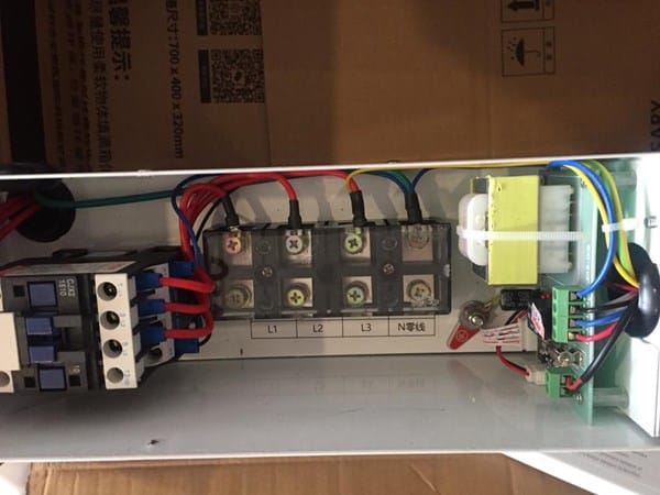 Pero yo veo otro problema, si unes las 3 fases para poner las resistencias en paralelo y conectar a 1x220V, por ese neutro verde (que debería ser blanco o azul) que parece de la misma sección que las fases, va a pasar el triple de corriente que por los cables de fase, unos 25A. Si ese cableado no esta sobredimensionado, se acabará quemando el cable verde.