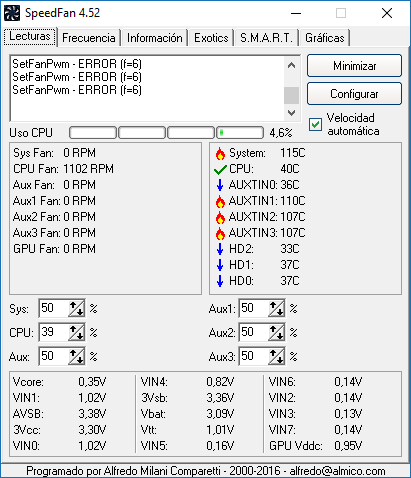 Desde hace una semana he notado que el pc hace mucho ruido por los ventiladores, así que decidí instalarle el speedfan. Después de configurarlo, me da temperaturas superiores a 100 grados en varios sensores. Tengo la duda de si es cuestión del programa o si realmente aunque no creo, está a la temperatura que marca, aunque esos ventiladores no los puedo controlar. Gracias de antemano.