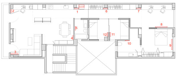 Por ejemplo. La vivienda está dividida claramente en zona de día (radiadores 1 a 5) y zona de noche (radiadores 6 a 12).