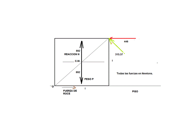 Para analizarlo toma un plano paralelo a una de las caras del cubo que pase por el C.M.y trabajarias sobre ese plano. O sea sobre una superficie cuadrada de lado l que concentren su C.M. el peso total del cubo = 892 N.