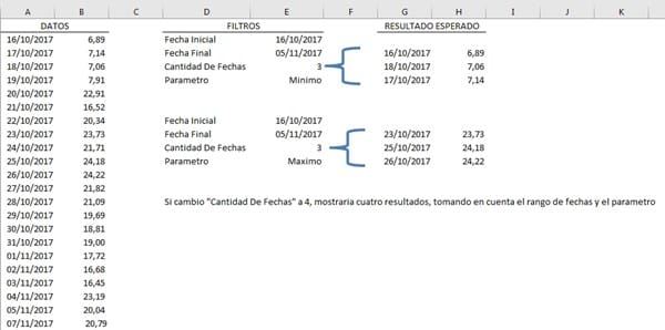 Sub filtrar() Dim funcion As WorksheetFunction Set DATOS = Range("a2").CurrentRegion Set funcion = WorksheetFunction fecha_i = Range("e2") fecha_f = Range("e3") parametro = UCase(Trim(Range("e5"))) dias = Val(Range("e4")) Set resultado = Range("g2").Resize(dias, 2) With DATOS cuenta = funcion.CountIfs(.Columns(1), ">=" & CDbl(fecha_i), .Columns(1), "<=" & CDbl(fecha_f)) fila = funcion.Match(CDbl(fecha_i), .Columns(1), 0) Set fechas = .Rows(fila).Resize(cuenta) If parametro = "MÍNIMO" Then For i = 1 To dias res = funcion.Small(fechas.Columns(2), i) fila = funcion.Match(res, fechas.Columns(2), 0) With resultado .Cells(i, 2) = res .Cells(i, 1) = fechas.Cells(fila, 1) .Cells(i, 1).NumberFormat = "dd/mm/yyyy" End With Next i Else For i = 1 To dias res = funcion.Large(fechas.Columns(2), i) fila = funcion.Match(res, fechas.Columns(2), 0) With resultado .Cells(i, 2) = res .Cells(i, 1) = fechas.Cells(fila, 1) .Cells(i, 1).NumberFormat = "dd/mm/yyyy" End With Next i End If End With Set DATOS = Nothing: Set fechas = Nothing Set funcion = Nothing End Sub