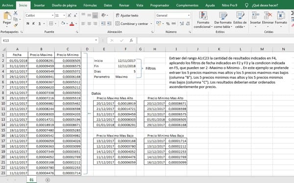 Es decir, en una celda escribo una fecha inicial, en otra una fecha final, en otra "mínimo": o "máximo", según convenga y en otra celda "5", estas celdas actuarían como filtro dando como resultado al ejecutar la macro un rango de fechas y precios atendiendo al filtro especificado.