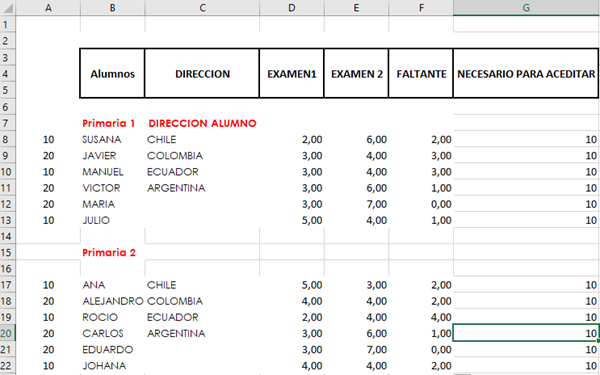 Necesito alguna macro o botón que me despliegue el nombre de los alumnos y al seleccionar alguno, me muestre los valores de la columna ALUMNO (B), NECESARIO PARA ACEDITAR (G), EXAMEN1(D), EXAMEN2(E) y FALTANTE(F). Sin embargo, que las columnas EXAMEN1 (D) Y EXAMEN 2 (E), se puedan editar los valores o en su defecto ir vacías.