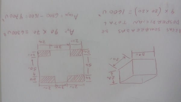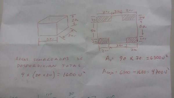 Imagina una caja en la intentar tomándola de lado. En un lado 20 abajo de ese lado 30, abajo del lado frontal 50 esas son sus dimensiones y como se hallan