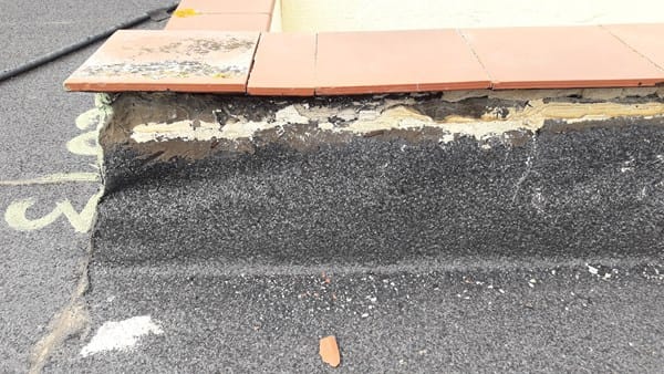 En nuestro edificio tenemos una cubierta plana no transitable impermeabilizada con laminas bituminosas. Las laminas en general están bien pero todo el perímetro de la cubierta está degradándose por una pésima ejecución en el encuentro con el murete perimetral. Tal como se ve aquí: