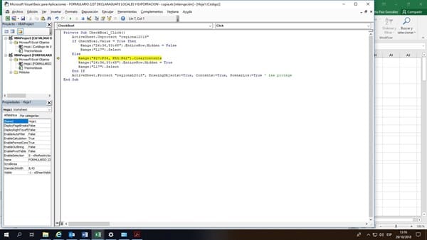 Quiero el apoyo de ustedes como expertos tengo un archivo en Excel, en la imagen hay una pregunta que dice ¿realiza operaciones de exportación?, si se activa el check entonces que muestra las filas de la 26 a la 36 y de la 53 a la 68, y al momento de desactivar el chek que las oculte, pero también deseo que ciertas celdas queden bloqueadas para que no se puedan modificar algunas formulas