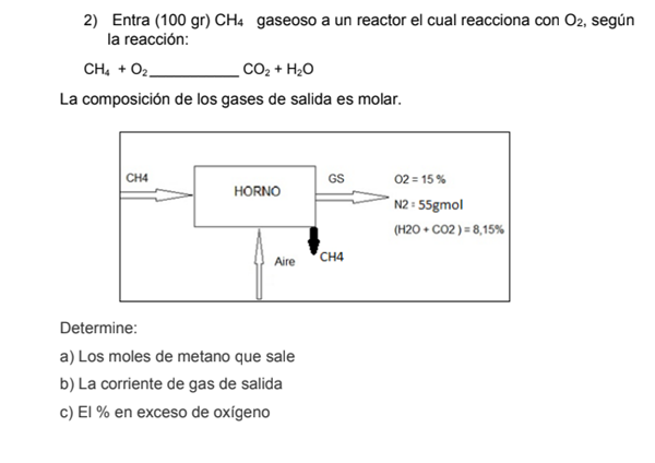 Entra 100gr CH4 gaseoso a un reactor el cual reacciona con O2, según la reacción CH4+O2--->CO2+H2O