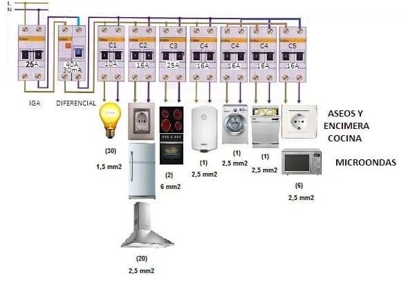 La idea es pasar todas las líneas/cables directos desde el subcuadro sin empalmes a cada electrodoméstico pasando por la caja de registro con cable de 2,5 pero no sé si la lavadora y el horno deben de ser de 4mm y cuantos magnetotérmicos necesitaría de 16/20 A? La cocina funcionará con gas butano.