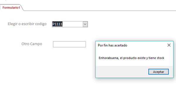 MsgBox "Enhorabuena, el producto existe y tiene stock", vbOKOnly, "Por fin has acertado"