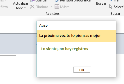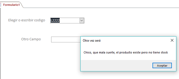 MsgBox "Chico, que mala suerte, el producto existe pero no tiene stock", vbOKOnly, "Otra vez será"