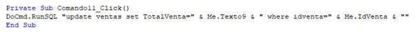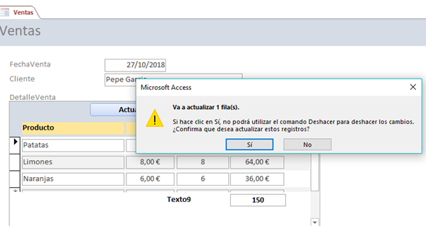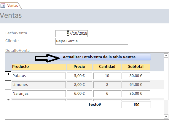 el problema que experimento es el siguiente: he creado un formulario FACTURA con su correspondente subformulario DETALLE DE FACTURA los cuales tienen sus orígenes de datos en dos tablas con sus correspondientes nombres, el caso es que no consigo enviarle el dato del TOTAL que, obtengo de la fórmula =Suma([SubTotal]), al campo de la tabla.