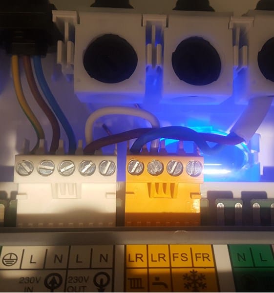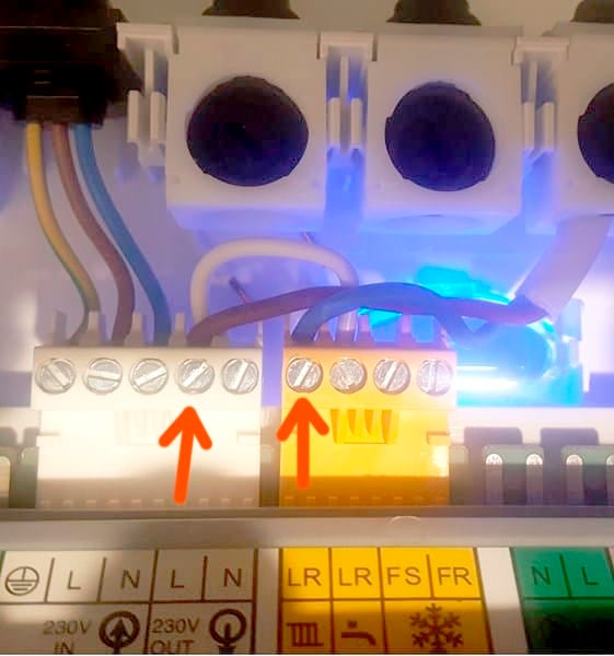 Esta presenta un puente desde el clip "Energy out 240 V L-N" (con cable) que sale desde L a otro clip a LR(RADIADOR) LR(agua sanitaria).