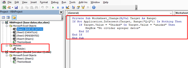 Tengo una tabla en excel donde lo que necesito es cuando en la columna "Q" aparezca la palabra "unidad" me lance un msgbox solicitándome que agregue a la tabla "numero de unidad" y "placas"