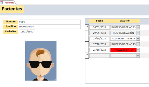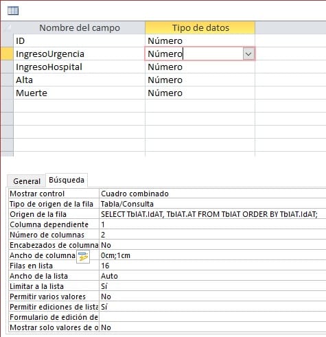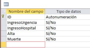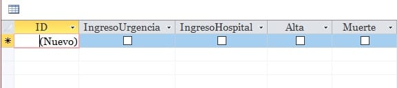 Tabla pacientes: Ingreso por urgencias (si o no), Ingreso hospital (si o no), Alta (si o no), Muerte (si o no)