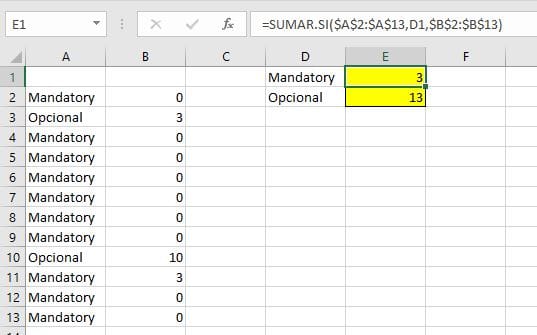 Mi código recorre las dos columnas y cada una las guarda en un vector, lo que intento hacer es sumar los datos de la columna 2, donde la columna uno diga mandatory, después los datos donde la columna diga opcional y mostrar la suma en una celda, la base de datos es muy grande por lo cual hacerlo manualmente es difícil.