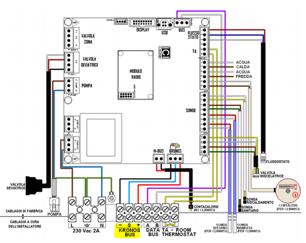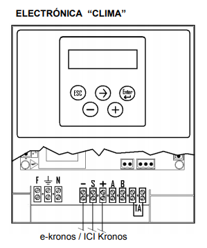 CONEXIONADO ELÉCTRICO: La comunicación entre el e-kronos y el módulo UTI se realiza por medio de bus. La conexión debe ser asegurada por un cable de tres hilos (kronos bus) de tipo apantallado con longitud máxima de 90 metros. No colocar nunca en el mismo corrugado los cables para la transmisión de datos con los cables de alimentación Pueden sin embargo pasar por el mismo corrugado los cables BUS de la Unidad Máster con los del ICI e-kronos. La unidad e-kronos está alimentada a 24 Vcc desde el módulo UTI. N.B. No invertir la polaridad de la alimentación Respetar la conexión + S –