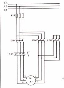 En el esquema tendrías el contactor de línea K1M ... el de estrella K2M y el de triangulo K3M. Es útil notar que el contactor de línea deberá estar dimensionado para la corriente nominal de trabajo. El de conexión estrella podrá dimensionarse para la tercera parte ( 33%) de la corriente nominal mientras que el del triangulo podrá serlo para 1/V3 = 58% de la corriente nominal.