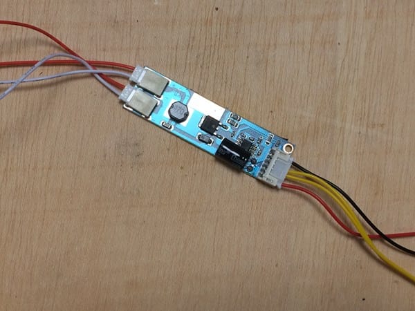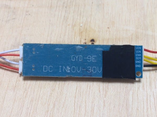 Tenemos el regulador DC/DC comprado en Aliexpress que como sabeis viene con cuatro cables (VIN, GROUND, ON/OFF Y DIM) para soldar en la placa del monitor.