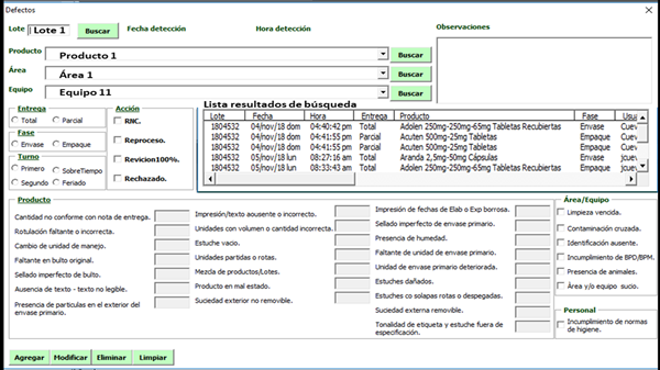 - cuando uso cualquiera de los criterios de busqueda lote, area, equipo, producto se desconfiguran los encabezados, esto también lo puede ver en la imagen anexa