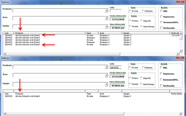 - el formulario no muestra todas la coincidencias en ninguno de los criterios de búsqueda por ejemplo como puede ver en la imagen si coloco el lote 1804532 que en la matriz esta registrado dos veces solo aparece una vez en el listbox.