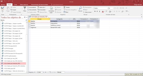 Tengo creada una consulta de referencias cruzadas para sacar los gastos e ingresos por cada trimestre. Aquí lo podéis ver: