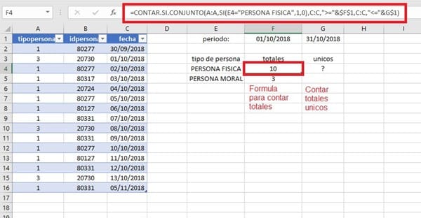 Tengo la formula para contar totales =CONTAR.SI.CONJUNTO(A:A,SI(E4="PERSONA FÍSICA",1,0),C:C,">="&$F$1,C:C,"<="&G$1)