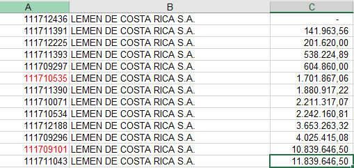 "5 560 039,09" ; y entonces verifico si el dato de la columna "A" que es 111709101 esta en rojo debe buscar el siguiente y volver a verificar que la columna "A "el código que este no se encuentre en rojo la letra entonces cuando este en negro la letra tomo el dato de la columna "A" que es 111709101 lo coloreo de rojo y lo pongo en la celda R29.