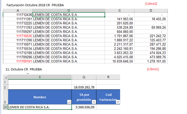 Tengo el libro1(11. Octubre CR_PRUEBA) donde desde la columna B4 empiezan a ver nombres y tengo el libro 1 (Facturación Octubre 2018 CR_PRUEBA) que desde la columba B2 empiezan tambien a ver nombres, entonces los pasos serian: