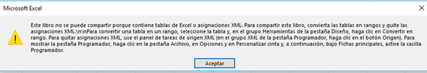 Quisiera ver quien me puede ayudar para poder compartir un libro excel con macros en la red de mi casa. Lo eh intentado pero me arroja el siguiente mensaje y la única tabla que tenia la transforme en rango.