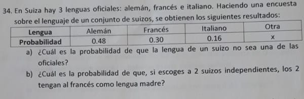 Problema: ¿Calcular cuál es la probabilidad de que la lengua madre de un suizo no sea una de las oficiales?