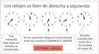 Para hacer la lectura tiene que ir leyendo de una en una las diferentes esferas, asi si la primera aguja se encuentra entre el 7 y el 8, pongo por caso, Ud. debe de leer 70000; la segunda esfera se encuentra entre el 4 y el 3, debe de leer 3000; la siguiente esfera le marca entre el 0 y el 1, debe de leer 0; la siguiente marca entre el 5 y el 6 Ud. debe de leer 50; y por último si marca entre el 9 y el 0, leerá 9; ahora haga la suma alineada de cifras y tendrá 70000+3000+0+50+9 =73059 m3. Las demás esferas se pueden leer también para una mayor precisión, pero las lecturas que se toman para facturar solamente se toman los m3., no se toman las fracciones.**