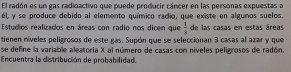 El radón es un gas radioactivo. Estudios realizados nos dicen que 1/3 de las casa tienen niveles peligrosos de Radón. Supón que se seleccionan 3 casas al azar, y que se define la variable aleatoria X, al numero de casas con niveles peligrosos de Radón. Encuentra la distribución de probabilidad.