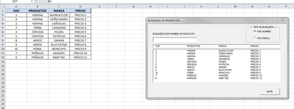 Tengo un userform1 y una base de datos (hoja1) con productos. Lo que necesito es buscar un producto por el nombre del producto o por el nombre y la marca.