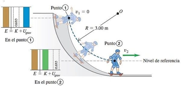 8.-Imagine que su primo Morton baja en patineta por una rampa curva en un parque. Tratando a Morton y a su patineta como una partícula, ésta describe un cuarto de círculo de radio R = 3,00 m (figura). La masa total de Morton y su patineta es de 25,0 kg. Él parte del reposo y no hay fricción. a) Calcule su rapidez en la base de la rampa. b) Obtenga la fuerza normal que actúa sobre él en la base de la rampa.