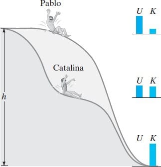 3.-Rapideces sobre dos resbaladillas de agua. Dos resbaladillas de agua sobre una alberca tienen formas diferentes, aunque ambas comienzan a la misma altura h. Dos personas, Pablo y Catalina, parten del reposo al mismo tiempo en diferentes resbaladillas. a) ¿Quién, Pablo o Catalina, llegará con mayor rapidez al fondo? b) ¿Quién llegará primero al fondo? Ignore la fricción y suponga que ambas resbaladillas tienen la misma longitud de trayectoria.