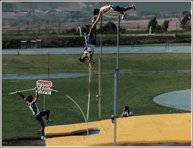 4.-Salto con pértiga. Estime la energía cinética y la rapidez requerida para que un saltador con pértiga de 70,0 kg libre justamente la barra horizontal colocada a 5,0 m de altura. Suponga que el centro de masa del atleta está inicialmente a 0,90 m desde el suelo y que alcanza su altura máxima al nivel de la barra misma.