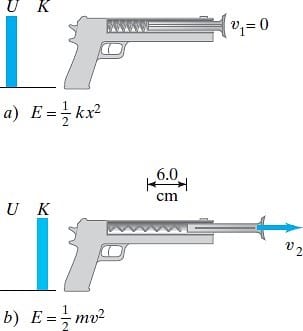5.-Arma de juguete. Un dardo de 0,100 kg de masa es oprimido contra el resorte de un arma de dardos de juguete, como se muestra en la figura. El resorte (con constante de rigidez k = 250 N/m y masa despreciable) se comprime 6,0 cm y luego se libera. Si el dardo se separa del resorte cuando éste alcanza su longitud normal (x = 0), ¿qué velocidad adquiere el dardo?