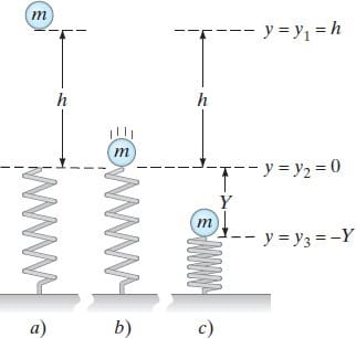 6.-Dos clases de energía potencial. Una pelota de masa m = 2,60 kg, que parte del reposo, cae una distancia vertical h = 55 cm antes de golpear un resorte vertical en espiral, al cual comprime una cantidad Y = 15,0 cm (figura). Determine la constante de rigidez del resorte. Suponga que éste tiene una masa despreciable e ignore la resistencia del aire. Mida todas las distancias desde el punto en que la pelota toca por primera vez al resorte sin comprimir (y = 0 en este punto).