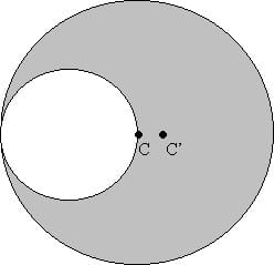 8.-En la figura se muestra como a una placa circular homogénea de radio R se le cortó un pedazo circular de radio R/2. Es claro que el centro de gravedad se ha movido de C a C’ a lo largo del eje x. Demuestre que la distancia de C a C’ es R/6.