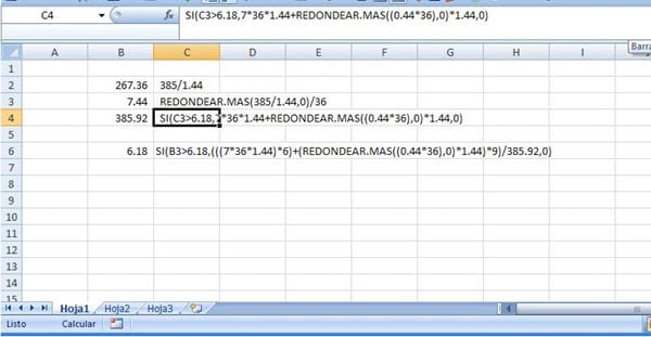 Que A2 diga "0,44x36" =15,84 ( redondo), B2 multiplique A2*1.44 , C2 diga "362,88*B2" = 385,92 , D2 diga 362,88*6"= 2177,28 , A3 diga B2 * 9= 207,36 , B3 sume D2+A3 y lo divida entre C2
