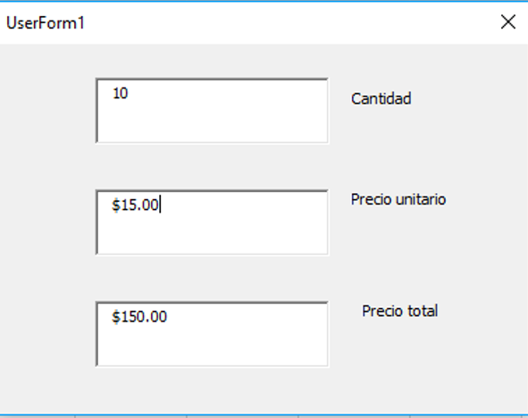 Private Sub TextBox1_Exit(ByVal Cancel As MSForms.ReturnBoolean) If TextBox1 <> "" And TextBox2 <> "" Then TextBox3 = CDbl(TextBox1) * CDbl(TextBox2) TextBox3 = VBA.Format(TextBox3, "currency") TextBox2 = VBA.Format(TextBox2, "currency") TextBox1 = Replace(TextBox1, ",", ".") End If TextBox2.SetFocus End Sub Private Sub TextBox2_Exit(ByVal Cancel As MSForms.ReturnBoolean) If TextBox1 <> "" And TextBox2 <> "" Then TextBox3 = CDbl(TextBox1) * CDbl(TextBox2) TextBox3 = VBA.Format(TextBox3, "currency") TextBox2 = VBA.Format(TextBox2, "currency") TextBox1 = Replace(TextBox1, ",", ".") End If TextBox1.SetFocus End Sub