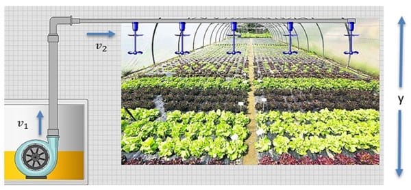 Se desea implementar un sistema de riego en un invernadero en las afueras de la ciudad. El sistema está conformado por una bomba que suministra agua a una velocidad de 2,70 m/s por una tubería de 2,30 cm de diámetro; esta tubería está conectada a otro tubo que alimenta un conjunto de aspersores, que hacen el riego sobre las flore (Por tanto, la tubería desde la motobomba hasta los aspersores tiene 2 diámetros diferentes). Con base en la anterior información, determine la velocidad de salida del agua que humedece las flores, si el diámetro por donde sale el agua en los aspersores es la mitad del diámetro de la tubería que está conectada a la bomba.