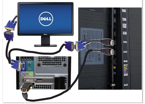 Hace algunos años cambie una pantalla también Samsung, pero esta era LCD y la cambie por una Samsung LED 4100, la computadora que tenia en ese entonces una HP solo tenia salida VGA y la pantalla LCD también contaba con ese puerto, por lo que compre un cable adaptador VGA con doble salida VGA para poder conectar el monitor y la pantalla al mismo tiempo y ver la misma imagen en ambas.